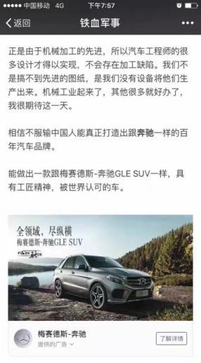 以目前各大企业堪称标配的微信号为例,目前微信号最常见的变现方式有:流量主、打赏、电商、合作广告及线下活动。据观察,铁血军事微信号已实现通过流量主及合作广告的方式进行了变现。顺带需要提到的是,铁血科技旗下国内规模最大的军品电商平台铁血君品行,及专门为军迷群体提供国内外军事旅游、技能拓展、知识等线下军迷活动的铁血俱乐部,也都在尝试利用微信号变现。